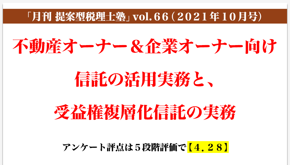 今回のセミナーは「不動産オーナー&企業オーナー向け信託の活用実務と、受益権複層化信託の実務」というテーマであった。特に「銀行スキームからの脱却」の部分で説明のあった銀行の提案スキームはよく目にするものであり、そのメリット・デメリットを明確にすることができた。今後の実務に役立てたい。
