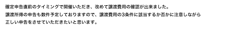 確定申告直前のタイミングで開催いただき、改めて譲渡費用の確認が出来ました。譲渡所得の申告も数件予定しておりますので、譲渡費用の3条件に該当するか否かに注意しながら正しい申告をさせていただきたいと思います。
