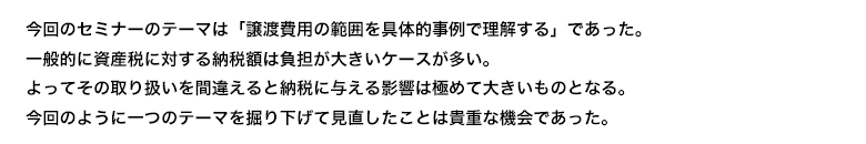 今回のセミナーのテーマは「譲渡費用の範囲を具体的事例で理解する」であった。一般的に資産税に対する納税額は負担が大きいケースが多い。よってその取り扱いを間違えると納税に与える影響は極めて大きいものとなる。今回のように一つのテーマを掘り下げて見直したことは貴重な機会であった。