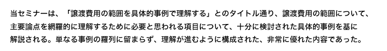 当セミナーは、「譲渡費用の範囲を具体的事例で理解する」とのタイトル通り、譲渡費用の範囲について、主要論点を網羅的に理解するために必要と思われる項目について、十分に検討された具体的事例を基に解説される。単なる事例の羅列に留まらず、理解が進むように構成された、非常に優れた内容であった。