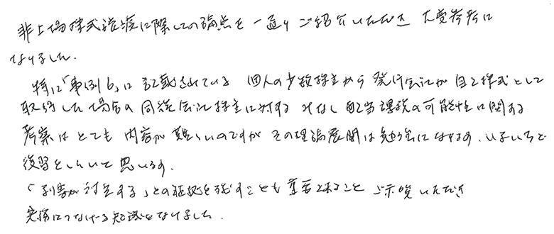 非上場株式の基本的な評価方法から、発展した考え方まで講義して頂き、理論的な考え方の必要性を感じました。身近な問題であり、難しい点も多いですが、基本に立ち帰って考えたいと思います。