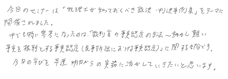 今回のセミナーは、「税理士が知っておくべき裁決・判決事例集」をテーマに開催されました。中でも特に参考になったのは、「裁判官の事実認定の手法~動かし難い事実を根幹とする事実認定(民事訴訟における事実認定)」に関する部分です。今日の学びを早速明日からの実務に活かしていきたいと思います。