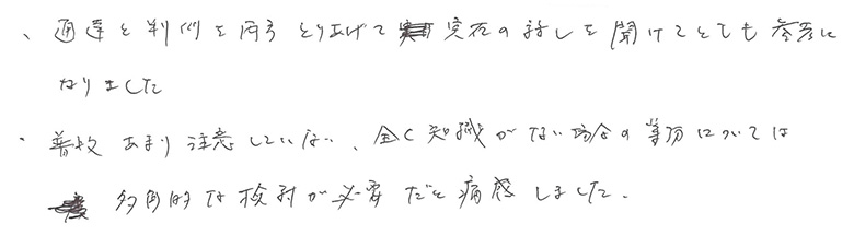 通達と判例を再度とりあげて実在の話しを聞けてとても参考になりました。普段あまり注意していない、全く知識がない場合の業務については、多角的な検討が必要だと痛感しました。
