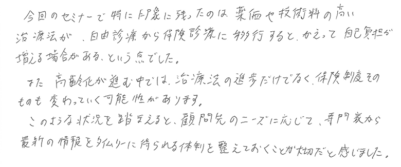 今回のセミナーで特に印象に残ったのは、薬価や技術料の高い治療法が、自由診療から保険診療に移行するとかえって自己負担が増える場合があるという点でした。また、高齢化が進む中では治療法の進歩だけでなく、保険制度そのものも変わっていく可能性があります。このような状況を踏まえると、顧問先のニーズに応じて、専門家から最新の情報をタイムリーに得られる体制を整えておくことが大切だと感じました。