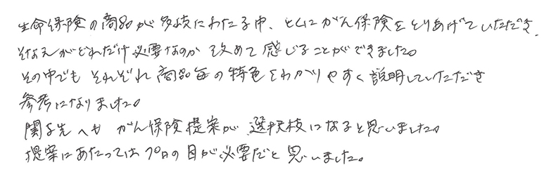 生命保険の商品が多岐にわたる中、とくにがん保険をとりあげていただき、そなえがどれだけ必要なのか、改めて感じることができました。その中でも、それぞれ商品毎の特色をわかりやすく説明していただき、参考になりました。関与先へも、がん保険提案が選択肢になると思いました。提案にあたってはプロの目が必要だと思いました。