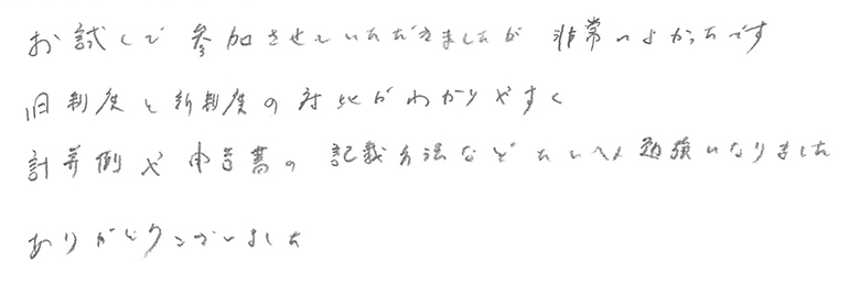 お試しで参加させていただきましたが非常によかったです。旧制度と新制度の対比がわかりやすく、計算例や申告書の記載方法などたいへん勉強になりました。ありがとうございました。