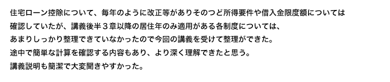 住宅ローン控除について、毎年のように改正等がありそのつど所得要件や借入金限度額については確認していたが、講義後半3章以降の居住年のみ適用がある各制度については、あまりしっかり整理できていなかったので今回の講義を受けて整理ができた。途中で簡単な計算を確認する内容もあり、より深く理解できたと思う。講義説明も簡潔で大変聞きやすかった。