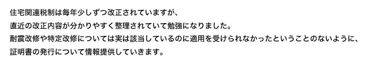 住宅関連税制は毎年少しずつ改正されていますが、直近の改正内容が分かりやすく整理されていて勉強になりました。耐震改修や特定改修については実は該当しているのに適用を受けられなかったということのないように、証明書の発行について情報提供していきます。