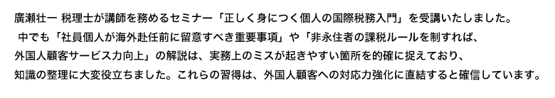 廣瀬壮一税理士が講師を務めるセミナー「正しく身につく個人の国際税務入門」を受講いたしました。中でも「社員個人が海外赴任前に留意すべき重要事項」や「非永住者の課税ルールを制すれば、外国人顧客サービス力向上」の解説は、実務上のミスが起きやすい箇所を的確に捉えており、知識の整理に大変役立ちました。これらの習得は、外国人顧客への対応力強化に直結すると確信しています。