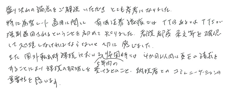 盛り沢山の論点をご解説いただき、とても参考になりました。特に為替レート適用に関して、有価証券譲渡ではTTBあるいはTTSが強制適用されるということを初めて知りました。都度都度、条文等を確認して処理しなければならないと切に感じました。また国外転出時課税において、5年以内の帰国時には、4か月以内に更正の請求をすることにより、課税の取消しを受けるとのこと。納税者とのコミュニケーションの重要性を感じます。