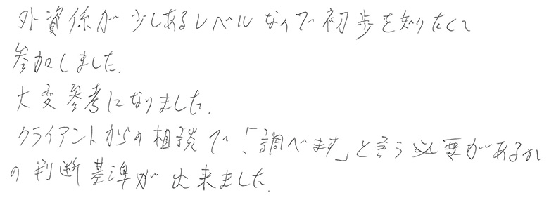 外資係が少しあるレベルなので初歩を知りたくて参加しました。大変参考になりました。クライアントからの相談で、「調べます」と言う必要があるかの判断基準が出来ました。